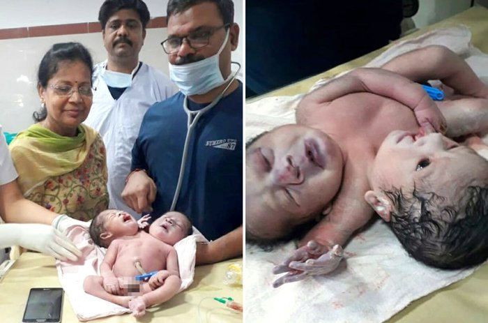 Em bé sinh ra với dị tật bẩm sinh với 2 đầu, 3 tay và chung cơ quan nội tạng.