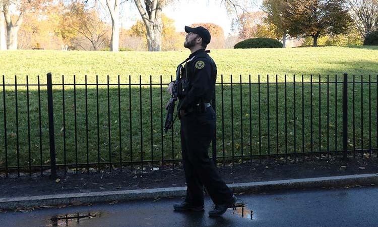 Một đặc vụ thuộc Cơ quan Mật vụ Mỹ quan sát bầu trời trong lúc Nhà Trắng bị phong tỏa hôm nay. Ảnh: Reuters.