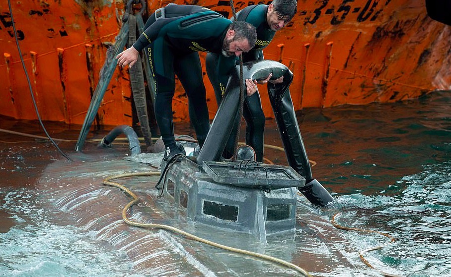 Giới chức Tây Ban Nha cho biết, đây là lần đầu tiên nước này phát hiện một chiếc tàu ngầm được dùng để vận chuyển ma tuý. Hôm 26/11, cảnh sát đã lấy ra nhiều kiện ma tuý trên tàu này.