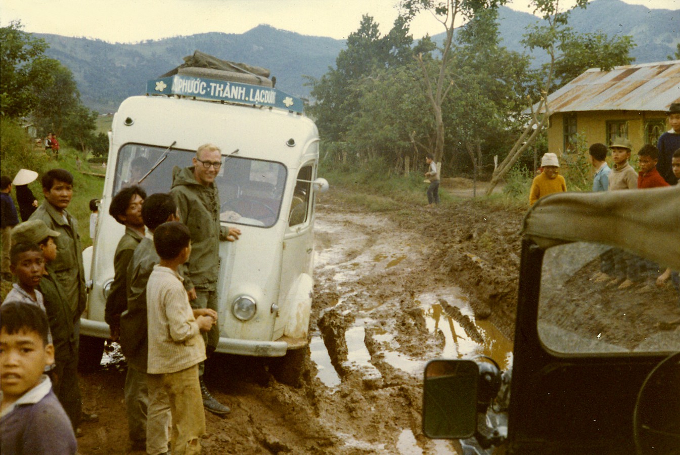Ông Tom Petersen tươi cười bên chiếc xe khách đang bị mắc kẹt tại một đoạn đường ngập bùn trên đường từ Đà Lạt về căn cứ của mình 9 (quốc lộ 20). Ảnh: Tom Petersen.