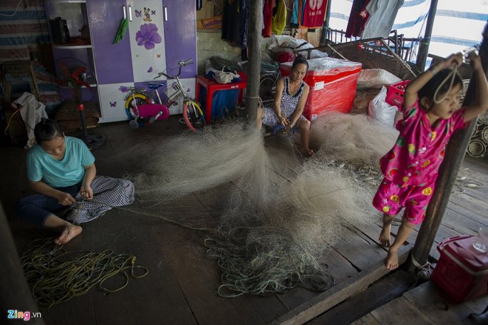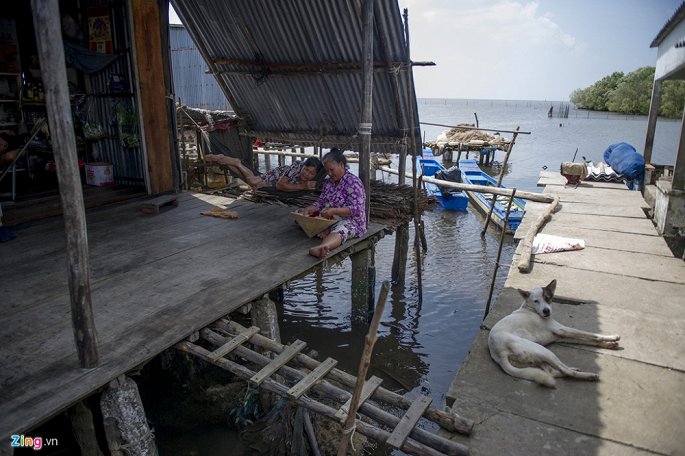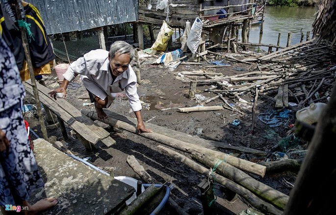 Ông Tư "cụt" là cư dân của xóm đảo đã hơn 30 năm nay. Công việc hàng ngày của ông là phụ giúp các con làm nghề giăng câu cá ngát ở vùng biển gần bờ. Ông nói căn nhà của ông đã nhiều lần sửa chữa, mọi thứ nhếch nhác, thường xuyên hư hỏng vì triều cường, sóng lớn.