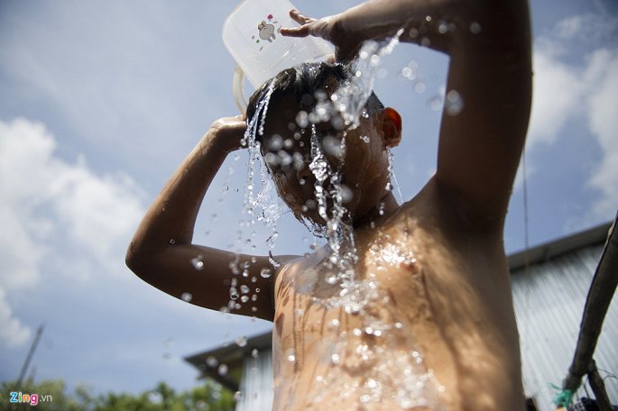 Một cậu bé vừa tắm dưới dòng nước biển, sau đó tắm lại nước ngọt chỉ với một ca nhựa duy nhất để tiết kiệm nước. Xóm chưa có nước sạch. Cả xóm có 5 hộ dân tự khoan giếng nước, nhưng hầu hết giếng nước đều có vị mặn, khó dùng. Nước sạch được mọi người dự trữ từ nước mưa và dùng thêm nước giếng. Nhiều người mong mỏi xóm đảo của họ được chính quyền quan tâm, kéo ống nước sạch về dùng.