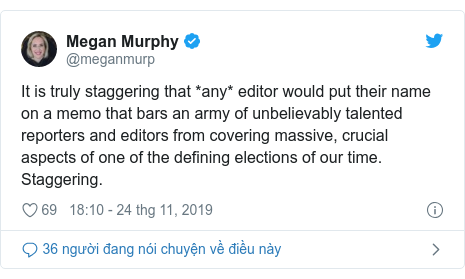 Megan Murphy, một cựu biên tập viên của Bloomberg, đă tweet rằng thật là "đáng kinh ngạc" khi biên tập viên ngăn phóng viên đưa tin về cuộc bầu cử.