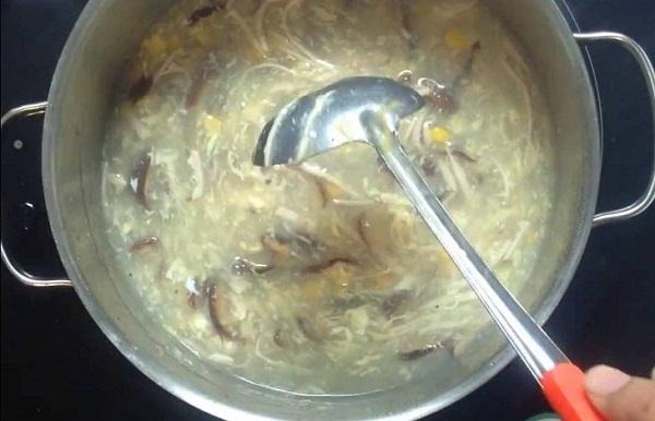 - Bước 4: Pha 4 muỗng bột năng với một ít nước rồi chế vào nồi súp. Dùng vá đảo đều lại lần nữa cho món súp có độ sánh dẻo như mong muốn rồi tắt bếp.