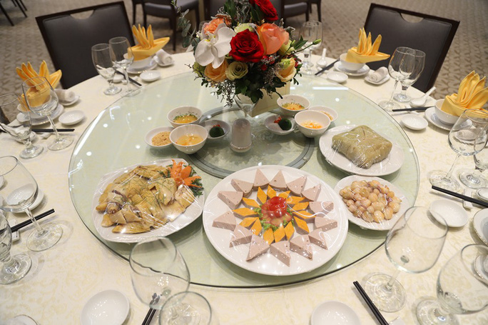Ngay từ cuối giờ chiều, phòng tiệc đã được chuẩn bị chu đáo, không gian ấm cúng với những món ăn đậm đà truyền thống của Việt Nam như bánh chưng, dưa hành, nem rán, giò chả, thịt nấu đông, canh măng sườn...