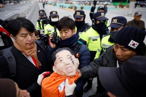 Người biểu tình xé hình nộm của đại sứ Mỹ trước Đại sứ quán Mỹ ở Seoul hôm 12/12.