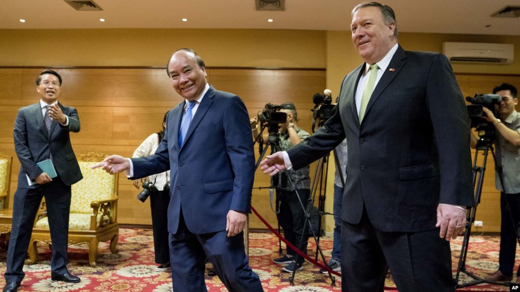 Ông Pompeo cho biết rằng các công ty Mỹ “đang tích cực hỗ trợ bằng cách đầu tư hàng tỷ đôla vào Việt Nam”, và rằng “trong hai thập kỷ qua, thương mại song phương đã tăng trưởng đáng kinh ngạc ở mức 7.000%”, từ mức khoảng 450 triệu đôla lên mức 60 tỷ đôla.