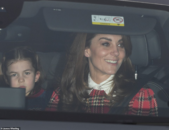 Tuy cả ba chỉ ngồi trong ô tô nhưng người hâm mộ chào đón họ hai bên đường vẫn soi được trang phục đến dự tiệc của các tiểu Hoàng tử, Công chúa đáng yêu. George diện một chiếc áo sơ mi trắng viền đen đơn giản theo phong cách đĩnh đạc, trông rất ra dáng anh cả. Trong khi đó, Charlotte diện một chiếc đầm có cổ đỏ, lồng bên ngoài là chiếc áo len màu xanh dương, cô bé còn được mẹ cột tóc hai bên trông vô cùng xinh xắn.