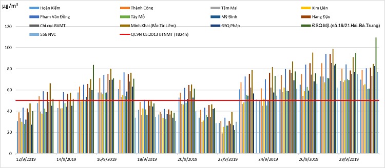 Từ 15 đến 17/9, chỉ số bụi mịn trung b́nh 24h tại 13 trạm đo, gồm 11 trạm của Chi cục bảo vệ môi trường Hà Nội, một trạm của Tổng cục Môi trường và một trạm của Đại sứ quán Mỹ đều vượt quy chuẩn Việt Nam. Trong đó, ngày 15/9, chỉ số ở trạm đo của Đại sứ quán Mỹ là trên 80 μg/m3.