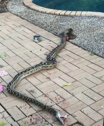 Một con trăn dài 4,5 m lẻn vào nhà quấn chân cậu bé 4 tuổi kéo đi. Rất may cha cậu bé đã dũng cảm cứu được con và cùng mọi người đánh chết con trăn.
