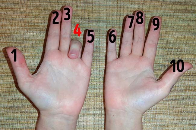 Đặt bàn tay của bạn trước mặt. Hãy quy định mỗi ngón tay có số riêng. Ví dụ, nếu bạn cần làm phép tính 4 × 9 thì tìm số ngón tay số 4 và co ngón tay đó lại.