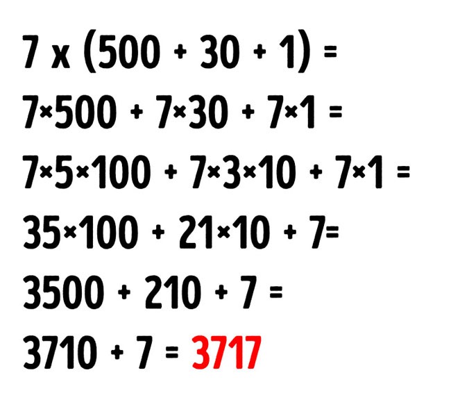 Ví dụ, bạn cần làm phép tính 7 × 531. Bạn có thể tính nhẩm bằng cách tách 531 thành tổng các số tròn là 500 + 30 + 1 rồi lấy lần lượt tình số nhấn với 7 và cộng lại là ra.