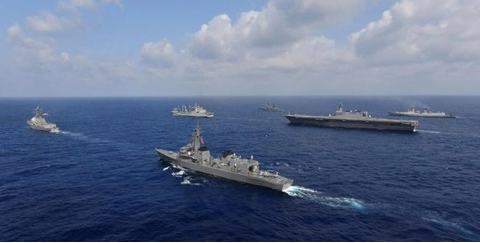Chiến hạm Mỹ - Ấn - Nhật - Philippines dàn đội hình diễn tập trên Biển Đông hồi tháng Năm. (Ảnh: Reuters)