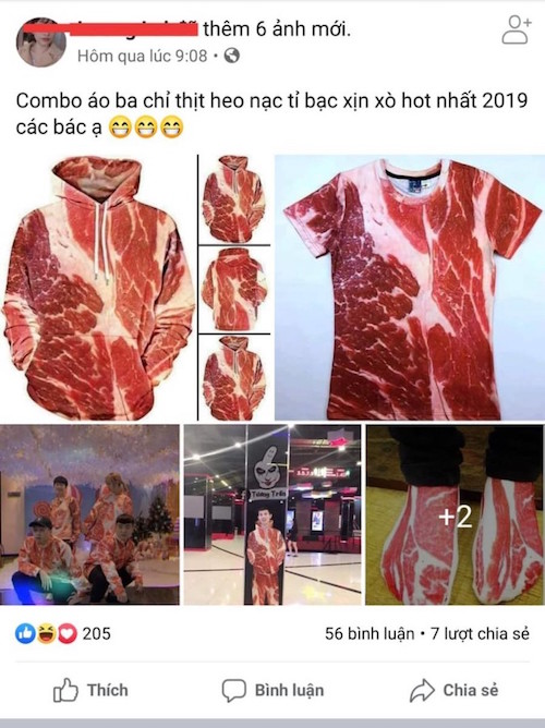 Cơn sốt thịt heo tăng giá khiến quần áo, áo khoác, tất chân,...in hình thịt heo ra đời. Vừa mới ra mắt cư dân mạng đã rất thích thú. Quần áo in hình thịt heo giờ phải đặt trước mới có.