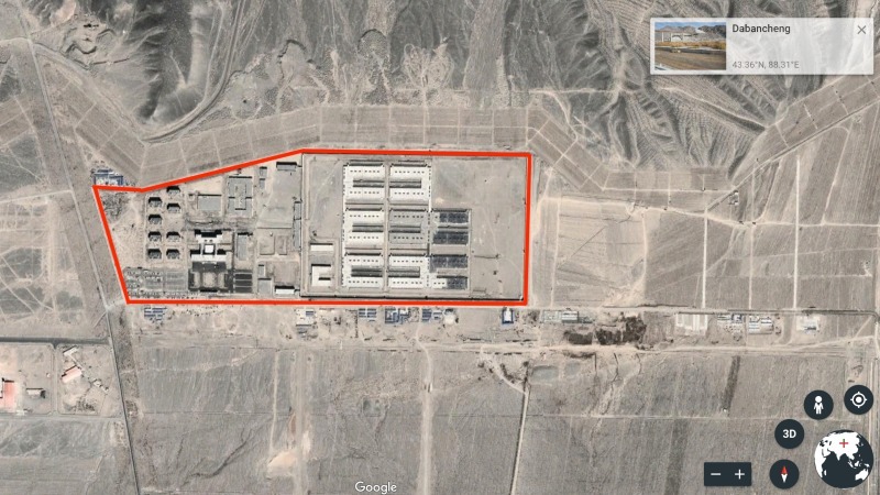 Một trại tập trung bên ngoài thị trấn Đạt Phản Thành ở Tân Cương, vào ngày 12/7/2015 còn là vùng hoang vu, đến 22/4/2018 đã xuất hiện một khu nhà tổ hợp quy mô lớn. (Ảnh chụp màn hình Google Earth)