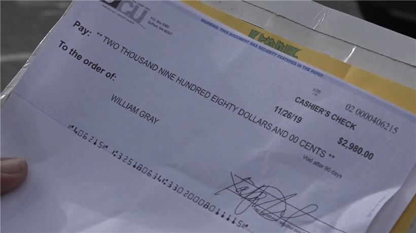 Sau đó, một tấm “cashier’s check” trị giá gần $3,000 được gửi đến tận nhà anh Gray. Họ nói rằng anh có thể giữ lấy $500 trong tấm “check,” số tiền còn lại là để trả cho công ty giúp dán các “sticker” quảng cáo lên xe hơi của anh.