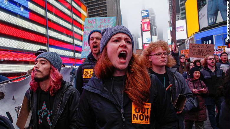 Người biểu tình phản đối chiến tranh tại Quảng trường Thời đại ở New York vào ngày 4/1/2020. Ảnh: CNN.