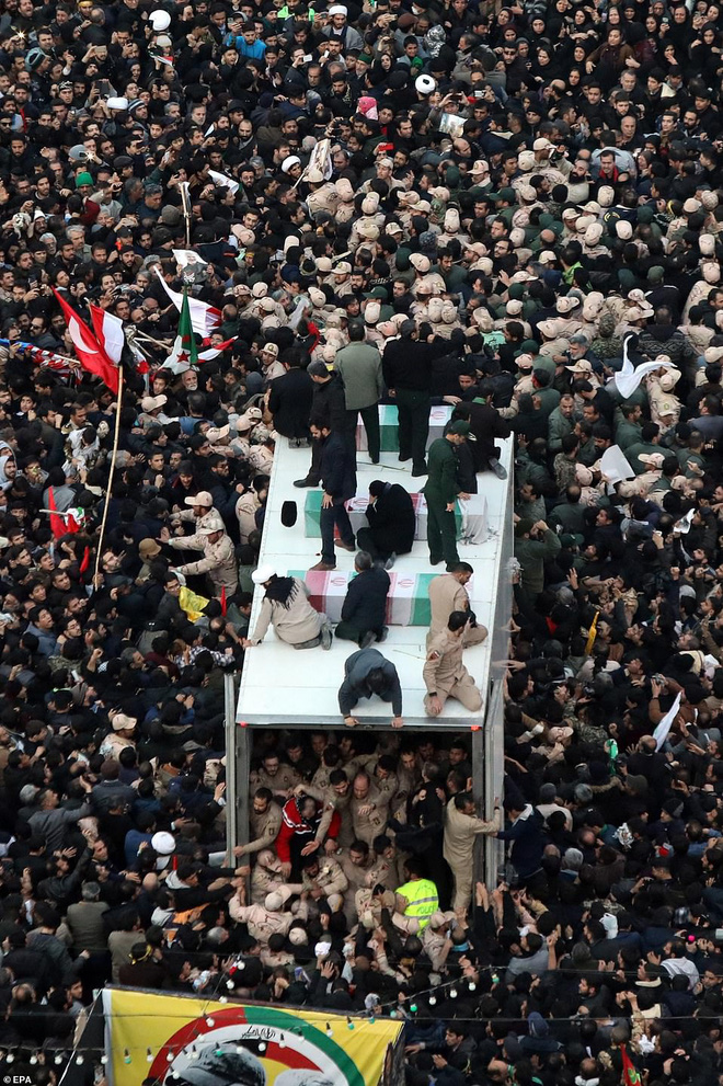 Theo Daily Mail, linh cữu của những công dân Iran thiệt mạng trong vụ Mỹ không kích tại Baghdad, Iraq - trong đó bao gồm thi thể của Thiếu tướng Quassem Soleimani, người đứng đầu lực lượng Quds của IRGC - đã được đưa về quê hương trên một chiếc máy bay dân dụng.