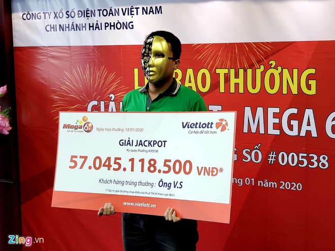Sáng 10/1, chi nhánh Hải Phòng của công ty TNHH MTV Xổ số điện toán Việt Nam (Vietlott) đã tổ chức lễ trao thưởng cho anh V.S, quê Ninh Bình, hiện là tài xế xe ôm công nghệ tại Hà Nội. Anh đã theo nghề này 4 năm và lựa chọn mang mặt nạ để giấu danh tính khi nhận giải.