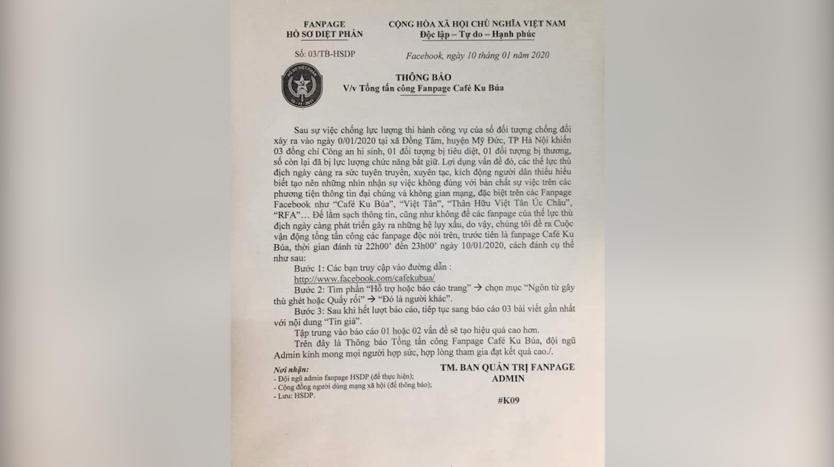 Tin Vietnam.- Ngày 14 tháng 1 năm 2020, trên cộng đồng mạng facebook Việt Nam loan truyền một văn bản của lực lượng có tên là Fanpage Hồ sơ diệt phản có nội dung chỉ đạo tổng tấn công Fanpage Café Ku Búa.