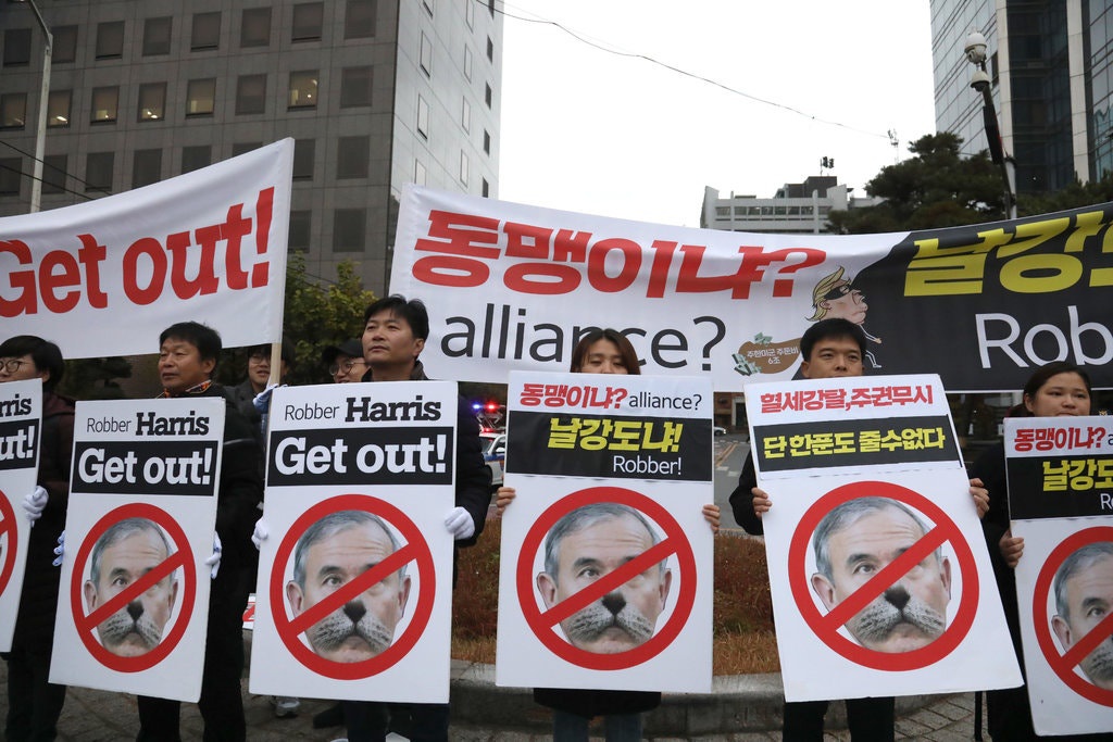 Trong một cuộc biểu tình ở trung tâm thủ đô Seoul tháng trước, nhiều nhà hoạt động trẻ tuổi bày tỏ sự phẫn nộ bằng cách “nhổ râu đại sứ” được gắn trên tấm áp phích lớn in hình ông Harris.