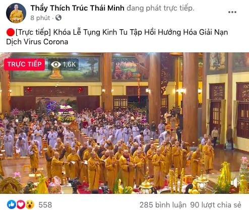 Livestream trên Facebook sư Thích Trúc Thái Minh về buổi tu tập “hóa giải” nạn dịch virus Corona tối 26 Tháng Giêng, 2020. (Hình: Hoài Đông/Thời Đại)