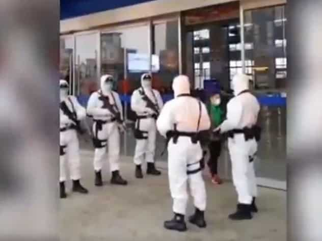 Hình ảnh tại địa phương: cảnh sát vũ trang tay cầm súng trường tự động đang mặc quần áo phòng hộ đứng gác tại bến xe ở Vũ Hán (Ảnh chụp màn hình video)