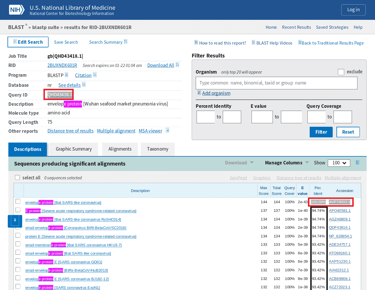 Kết quả cho thấy mẫu gen 100% tương đồng chính là từ AVP78033.1 tức E protein của virus corona trên dơi Chu Sơn ZC45. Mà mẫu ZC45 chính là do Viện Nghiên cứu Quân y Nam Kinh gửi lên NIH năm 2018.