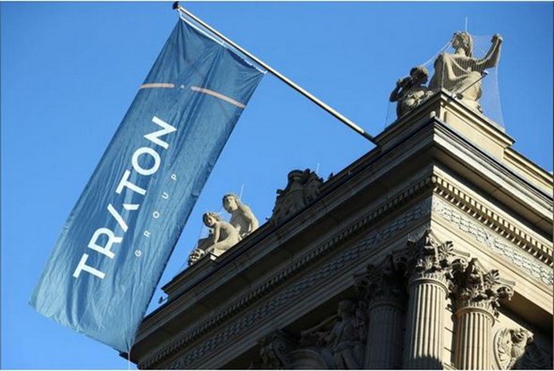 Cờ của hãng xe tải Traton SE của Volkswagen được in hình tại Sở giao dịch chứng khoán Frankfurt trong đợt chào bán công khai ban đầu (IPO) của Traton tại Frankfurt, Đức, ngày 28/6/2019. (Nguồn: Reuters)
