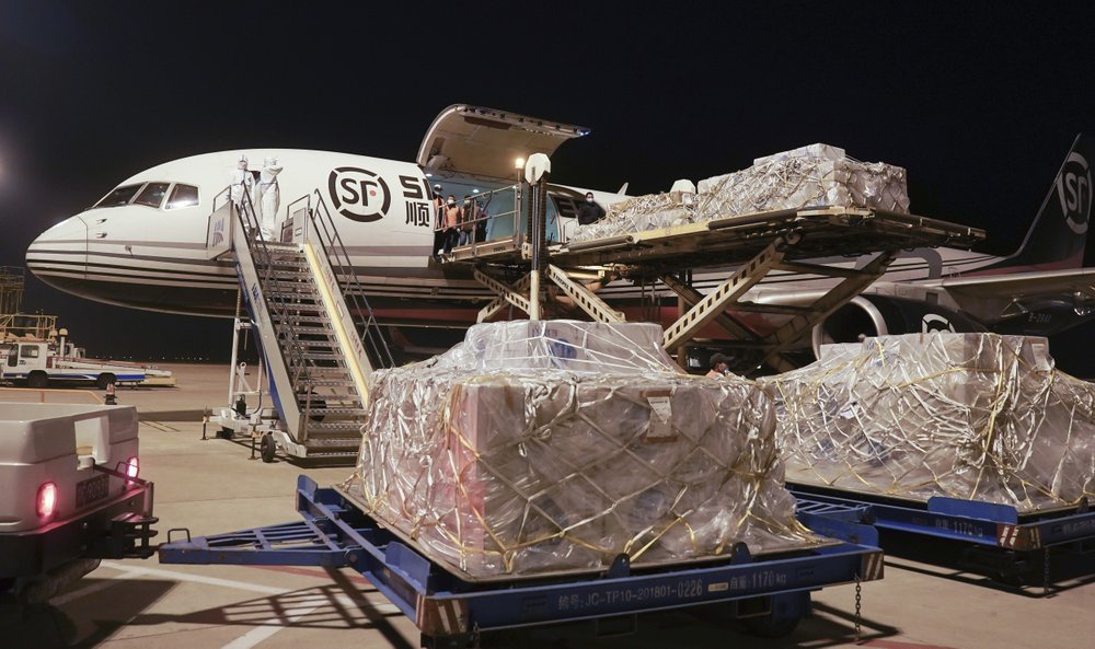 Hàng tiếp tế được đưa đến sân bay Vũ Hán ngày 30/1. Ảnh: AP.