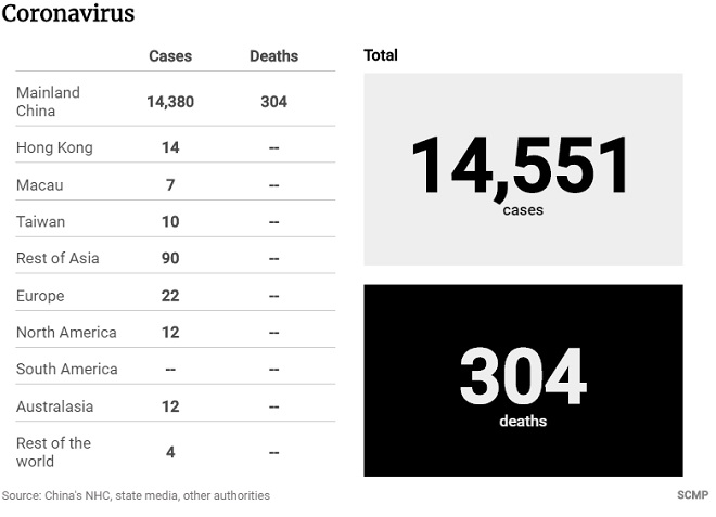 Theo SCMP, con số trên nâng tổng số người nhiễm virus ở Trung Quốc lên con số 14.380 người và số người tử vong là 304 người. Toàn bộ số người chết và 1.921 ca nhiễm mới ghi nhận ở tỉnh Hồ Bắc, vùng tâm dịch.