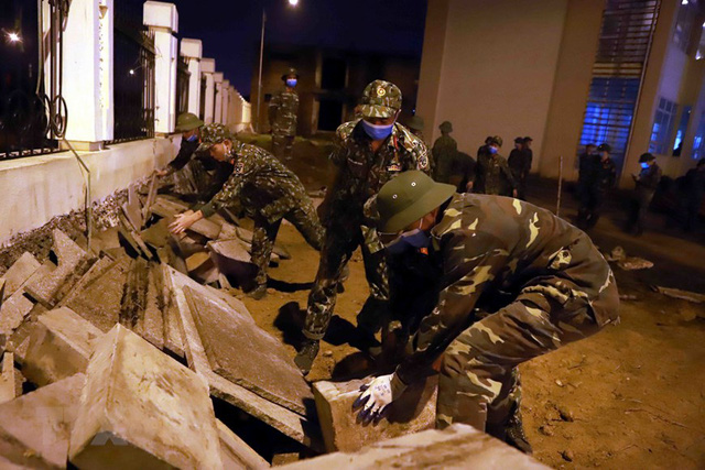 Lực lượng công an, bộ đội dọn vệ sinh các phòng dùng để làm bệnh viện dã chiến. (Ảnh: Hoàng Hùng/TTXVN)