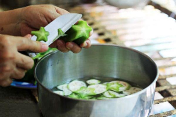 – Chuối và khế xanh rửa sạch bào mỏng, ngâm ngay vào bát nước muối loãng để không bị thâm đen. Sau đó, vắt kỹ, để ráo nước.