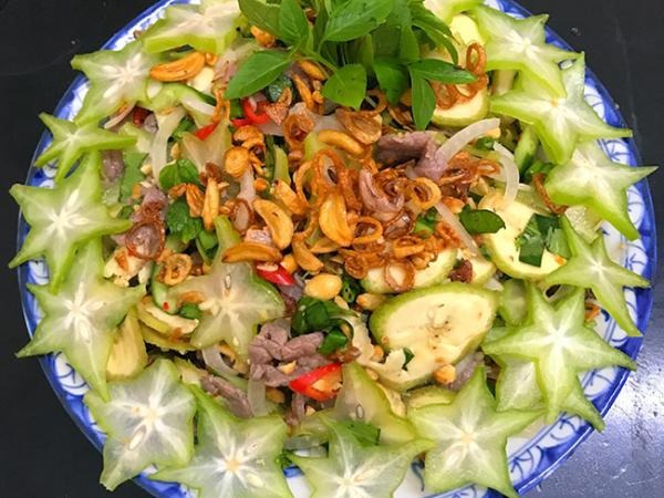 Đây là một món ăn ngon được người miền Nam rất ưa thí*ch. Gỏi bò bóp thấu có vị chua chua từ khế, chát từ chuối xanh kết hợp với mùi thơm từ hàn*h phi và vừng rang là một món ăn rất thí*ch hợp trong bữa cơm mùa hè.