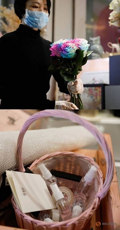Trong một tiệm hoa ở Bắc Kinh (Trung Quốc), Cai Xiaoman đeo khẩu trang, cẩn thận khử trùng tay bằng cồn rồi mang găng trước khi gói hoa. Xong xuôi, cô đặt một lọ nước rửa tay mới lên bó hoa rồi chuyển đi.