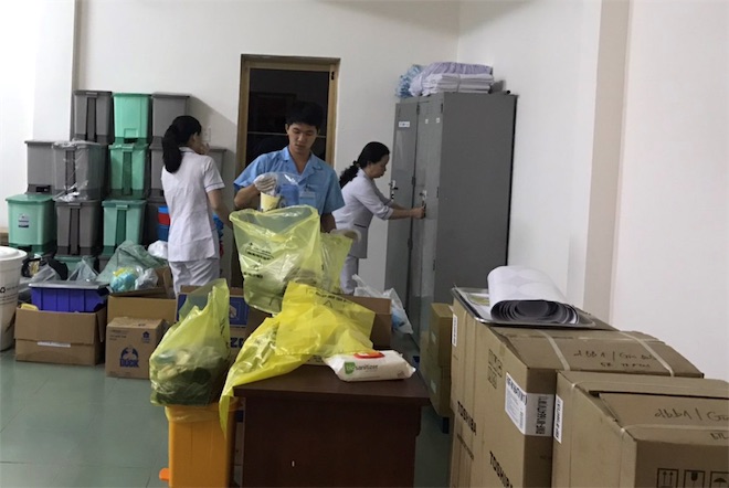 3 nhân viên khác chuẩn bị đồ dùng cá nhân và các tiện ích cho người sắp được cách ly tại khu hành chính của bệnh viện dã chiến.