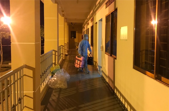 Một nhân viên kíp trực hỗ trợ mang hành lý của người cách ly lên phòng cách ly.