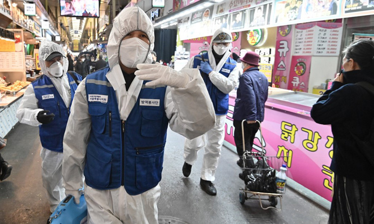 Nhân viên kiểm dịch Hàn Quốc phun thuốc khử trùng tại một khu chợ ở thủ đô Seoul hôm nay. Ảnh: AFP.