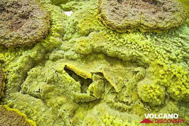 Dallol là tên người Afar địa phương dùng để chỉ sự chết chóc, phân hủy. Nơi đây có vVô số ao axit xanh (độ pH nhỏ hơn 1), oxit sắt, sulfur và cánh đồng muối.