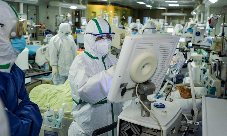 Các bác sĩ tại bệnh viện ở Vũ Hán, tỉnh Hồ Bắc, Trung Quốc điều trị cho bệnh nhân nhiễm nCoV hôm 25/2. Ảnh: AFP.