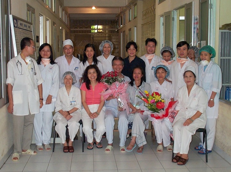 Y tá Nguyễn Thị Thục (người đầu tiên bên phải) cùng các đồng nghiệp chụp hình lưu niệm với bệnh nhân SARS rất nặng, ông Nguyễn Hữu Hùng (ôm hoa hồng), bênh cạnh là vợ và em gái ông. Một người thân của ông Hùng là bác sĩ Bệnh viện Việt Pháp chết vì SARS. Ông Hùng cùng em gái, tài xế đều bị nhiễm dịch. Ảnh: Nhân vật cung cấp.