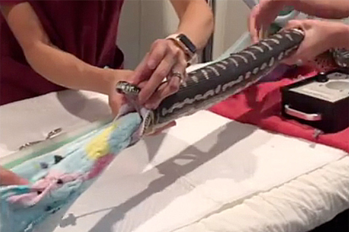 Đoạn video được bệnh viện Small Animal Specialist (SASH) ở TP Sydney – Úc đăng tải trên mạng xã hội Facebook cho thấy cảnh các bác sĩ đang rút một chiếc khăn đi biển ra khỏi con trăn.
