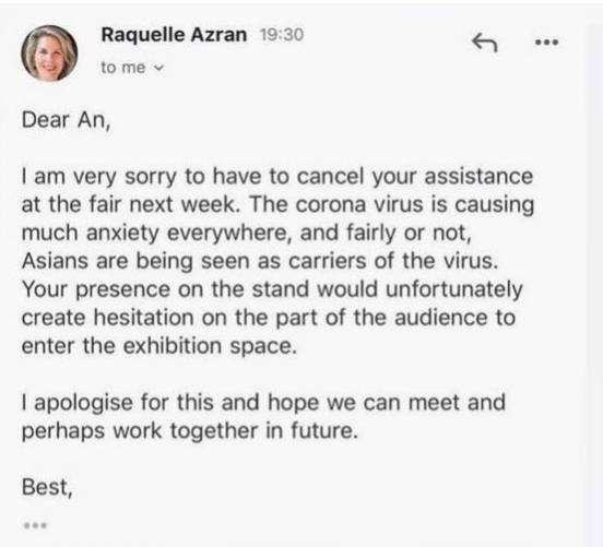 Kể từ khi đại dịch COVID-19 bùng phát thì thái độ kì thị người gốc Á diễn ra rất phổ biến. Cụ thể mới đây nhất là trường hợp của 1 người Việt đã bị loại khỏi triển lãm ở Anh. Dưới đây là những thông tin cụ thể. Một giám tuyển gốc Việt đã bị chủ gian hàng triển lãm người New York từ chối cơ hội làm việc tại hội chợ triển lãm Affordable Art Fair (AFF) tại London vào tuần sau vì người gốc Á bị xem là “những kẻ mang theo virus corona”.Giám tuyển An Nguyen đã đăng lên mạng ảnh chụp màn hình thư điện tử được gửi từ bà Raquelle Azran, chủ gian hàng triển lãm về chủ đề mỹ thuật đương đại của văn hóa Việt Nam.
