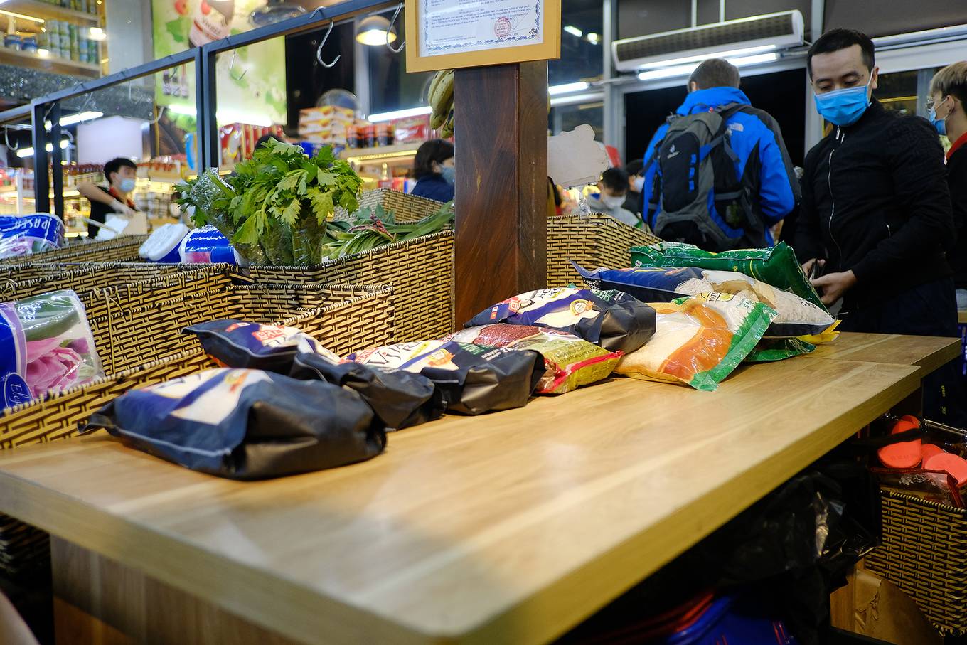 Nơi để gạo của siêu thị c̣n lèo tèo vài bao gạo. Đến 1h30 sáng, các mặt hàng đă thưa dần.