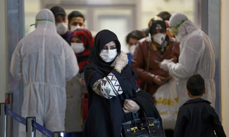 Hành khách Iraq trở về từ Iran được nhân viên y tế phát tờ thông tin tại sân bay quốc tế Najaf hôm 5/3. Ảnh: AFP.