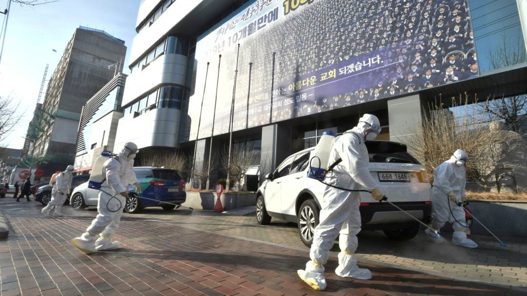 Nhân viên y tế khử trùng một con đường ở Hàn Quốc. Ảnh: Reuters