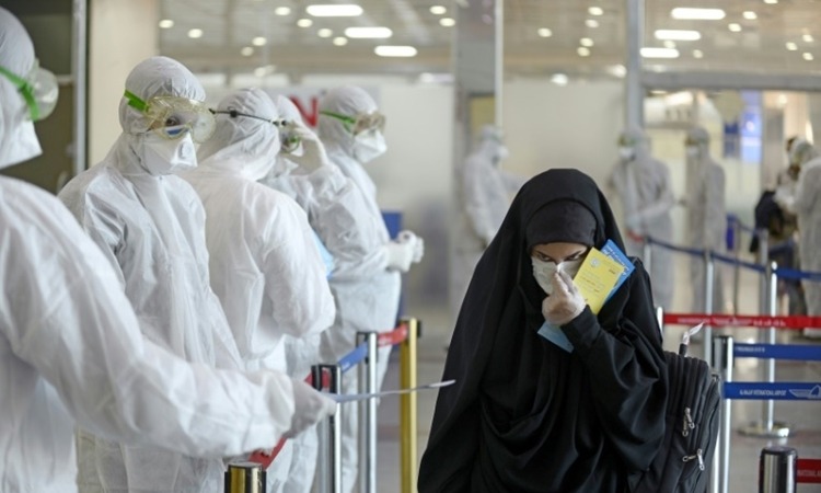 Nhân viên y tế phát tờ thông tin pḥng dịch cho hành khách đến từ Iran tại sân bay Najaf ở Iraq ngày 5/3. Ảnh: AFP.