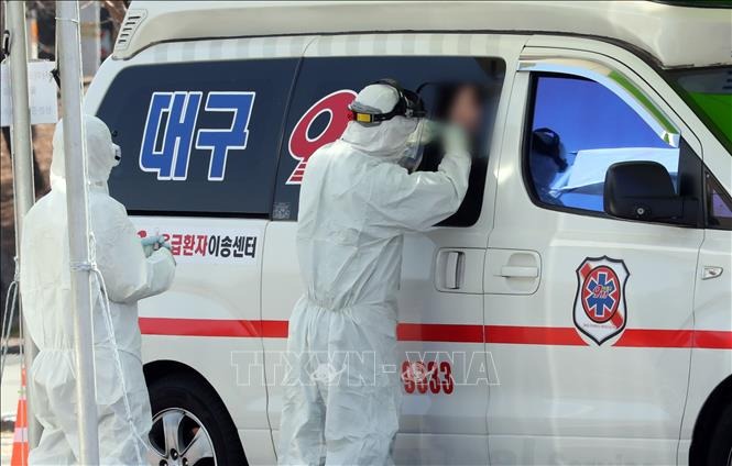 Nhân viên y tế lấy mẫu bệnh phẩm từ một trường hợp nghi nhiễm COVID-19 trên xe cứu thương tại thành phố Daegu, Hàn Quốc ngày 6/3/2020.