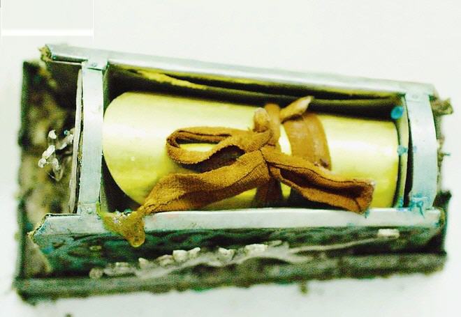 Cùng với việc thấy chiếc hộp vàng cuối cùng, tất cả đều kinh ngạc khi cuốn quanh chiếc hộp là một rải ruy băng màu đỏ tươi và trông cũng còn khá mới rồi sau đó lại ngả màu tương đối nhanh chóng. Các chuyên gia ngành khảo cổ đã lấy chiếc hộp vàng này ra nhưng tạm thời quyết định chưa mở nó.