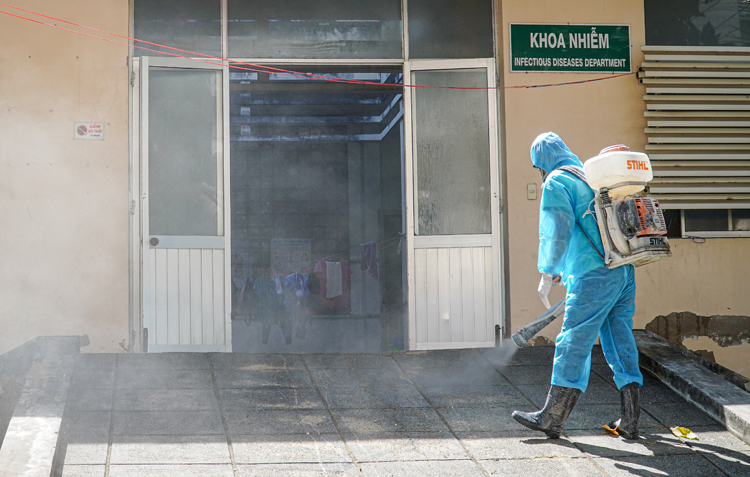 Phun thuốc khử khuẩn trước khoa Nhiễm Bệnh viện Đa khoa Bình Thuận, nơi điều trị các bệnh nhân Covid-19, ngày 12/3. Ảnh: Việt Quốc.